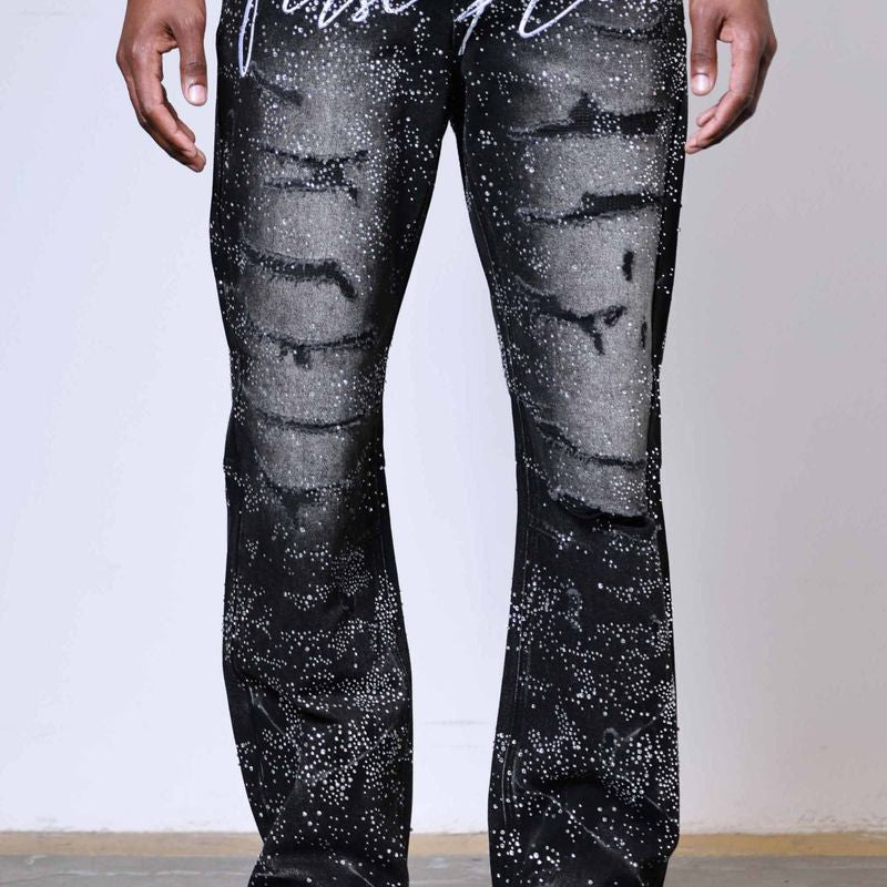 FRD ALLOVER RHINE STONE BLACK RIPPED PANTS