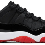 La edición 2025 de las Air Jordan 11 Retro Low 'Bred' lleva una parte superior de malla balística negra con un guardabarros de charol tonal. Un pequeño logotipo de Jumpman adorna la pestaña trasera de cuero negro, mientras que "Jumpman" y "Jordan" están inscritos en letras estilizadas a través de la lengüeta. Aumentado con la amortiguación de la suela de aire de longitud completa, una entresuela Phylon blanca está soportada por una suela de goma translúcida roja y una placa de resorte de fibra de carbono.
