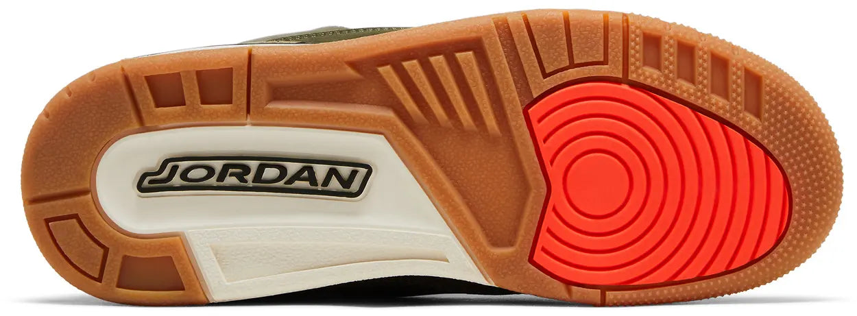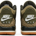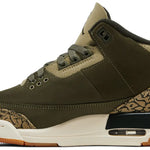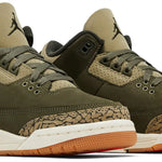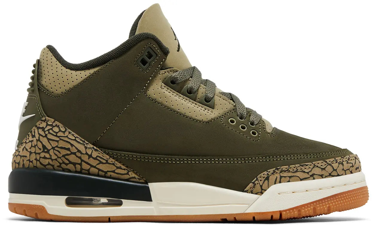 Hecho para niños grandes, el Air Jordan 3 Retro GS 'Family Affair' hace uso de una parte superior de nobuck verde oliva con superposiciones tonales con estampado de elefante en el antepié y el talón. Un logotipo bordado de Jumpman adorna la lengüeta, mientras que la marca Nike Air adorna la lengüeta moldeada del talón. La silueta heredada está montada sobre una entresuela de poliuretano blanquecino, equipada con amortiguación de suela de aire visible y acentuada con un toque de oliva oscuro que se envuelve alrededor del talón. Una suela de goma exterior ofrece una tracción de agarre bajo el pie.