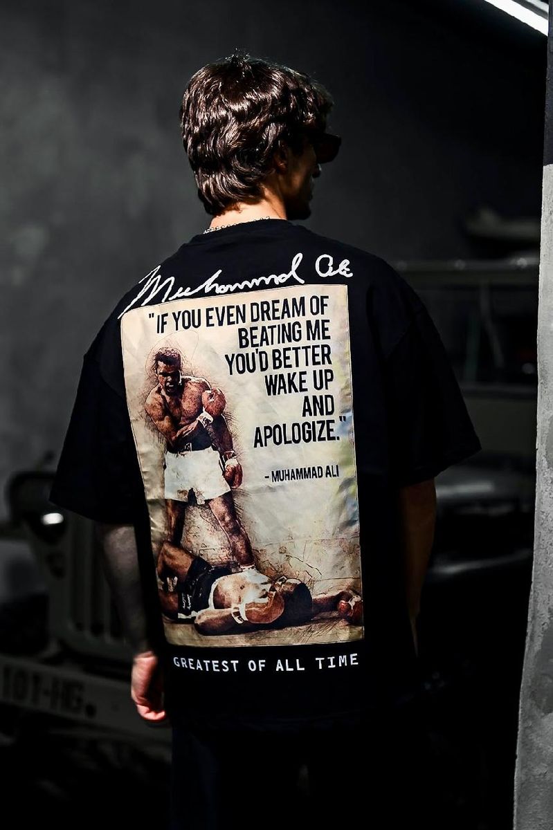 En NIB encontrarás la mejor calidad en nuestras camisas oversized. Este modelo presenta un diseño sutil con la frase "Muhammed Ali" en la parte superior delantera, ubicada al centro, y una imagen de Muhammed en la parte trasera.