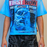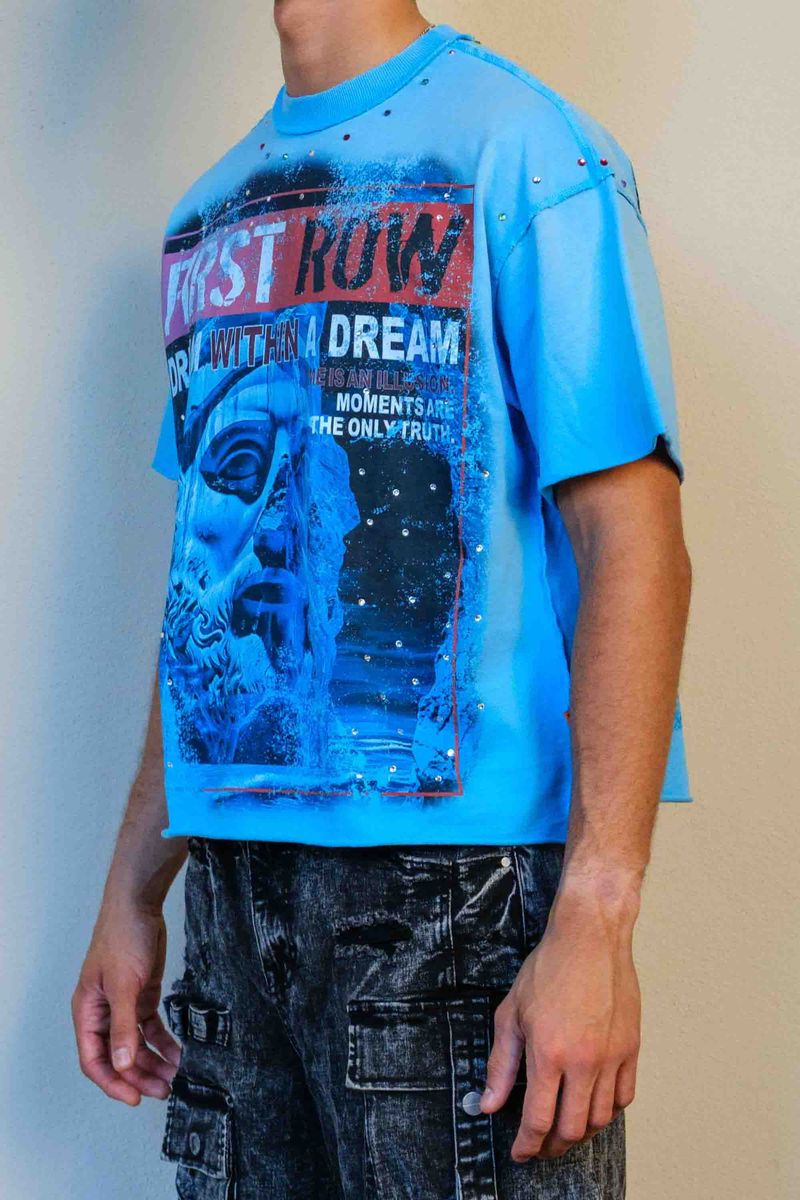 Camisa BoxFit en tono azul vibrante con detalles de brillo alrededor del cuello y las mangas. El frente destaca un diseño tipo póster con el texto “FIRST ROW” y la frase “Dream Within a Dream”, acompañado de una escultura clásica en tonos fríos. La parte posterior presenta un collage de gráficos estilo revista con mensajes como “Paradise Was Never Meant to Last”, “Dust” y “Made of Light, Left in Ruin”. Su estética mezcla arte clásico, efectos desgastados y colores intensos para un look urbano dramático. Es una pieza de impacto visual, ideal para estilos modernos y conceptuales.