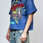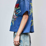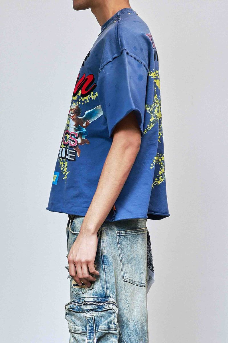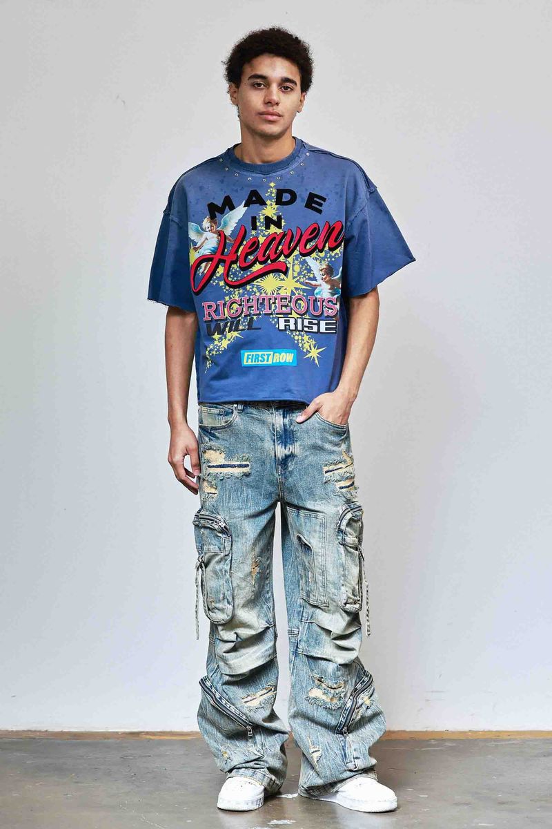 Camisa Box Fit azul con gráfico “Made in Heaven” y detalles de estrellas y ángeles que combinan un estilo urbano.