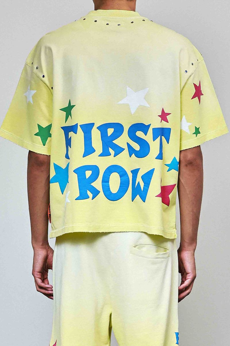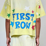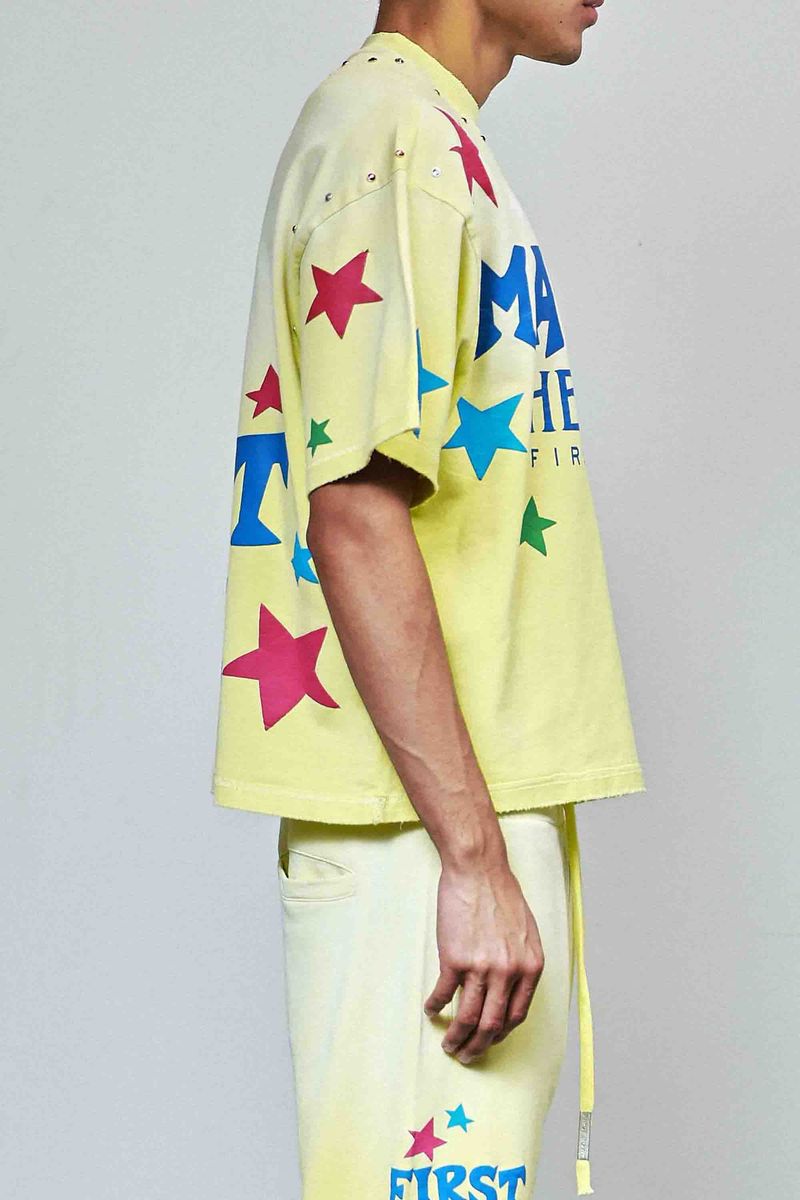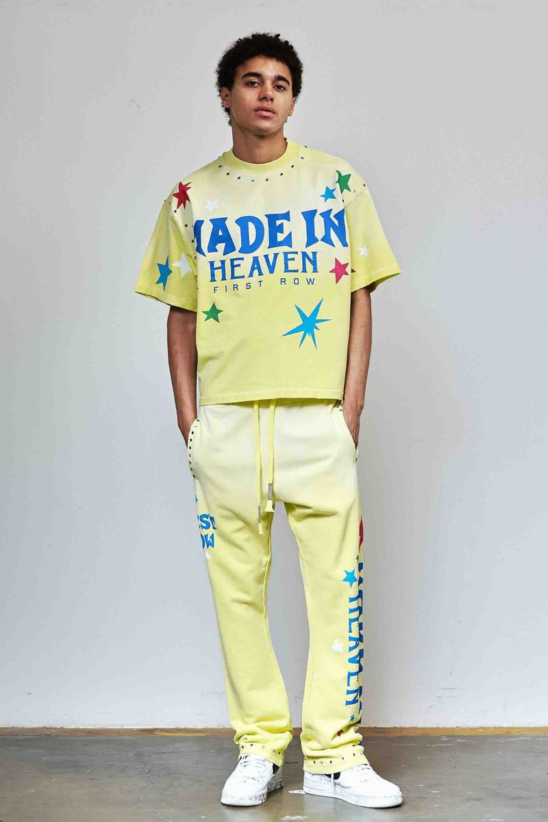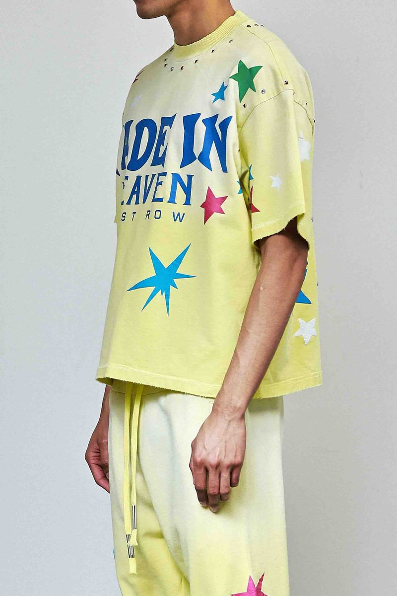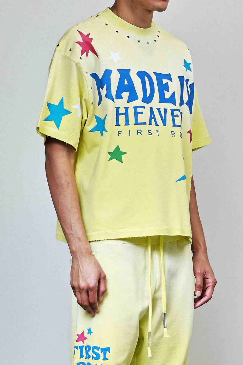 Camisa Boxfit amarilla con diseño “Made in Heaven” y detalles de estrellas en colores vibrantes. Un estilo llamativo y fresco ideal para outfits casuales.