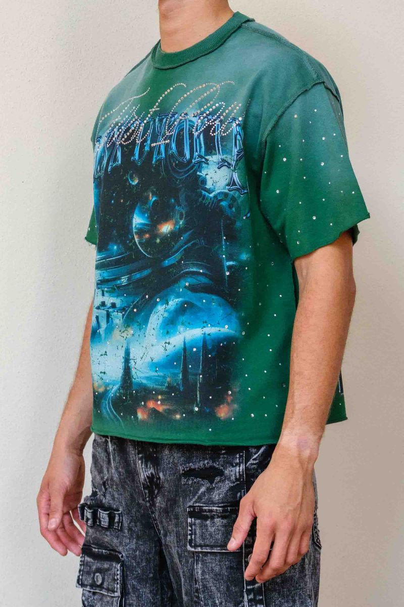 Camisa BoxFit en tono verde con detalles brillantes distribuidos en el cuello y las mangas. El frente presenta un diseño galáctico con un astronauta, planetas y arquitectura futurista en tonos azules, acompañado del logo First Rowen rhinestones cursivos. La parte posterior incluye los textos “Lost Utopia” y “Dream Within a Dream” en tipografías grandes con efecto metálico. La combinación de colores, brillo y arte espacial crea un look urbano con vibra cósmica. Es una pieza llamativa y conceptual, ideal para outfits que buscan impacto visual.