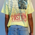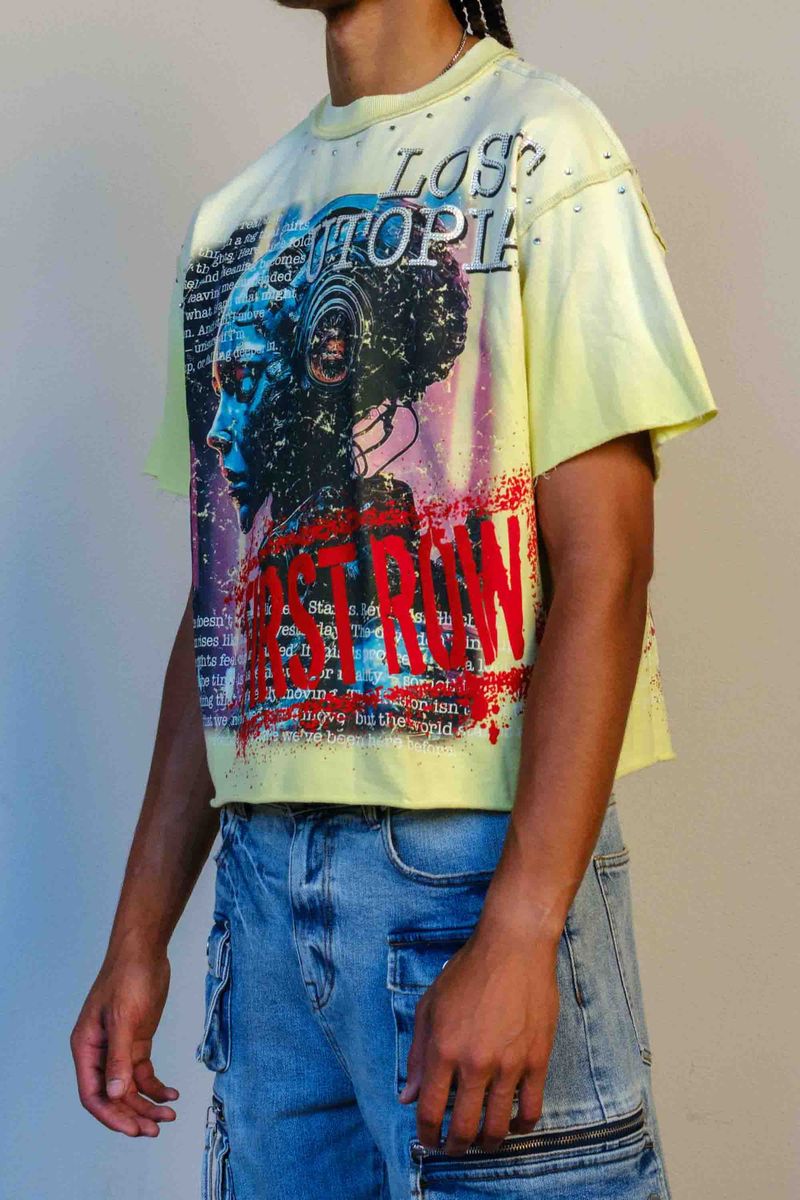 Camisa BoxFit en tono amarillo pastel con detalles de brillo en hombros y mangas. El frente presenta un diseño futurista con un rostro cibernético lleno de textura digital, acompañado del texto LOST UTOPIA en rhinestones y FIRST ROW en rojo desgastado. Sobre toda la pieza corre una capa de texto tipográfico que añade un efecto editorial y artístico. La parte posterior continúa el concepto con más tipografía, un panel gráfico estilo galaxia y el logo FIRST ROW al estilo spray. Es una pieza urbana conceptual, ideal para looks creativos y modernos.