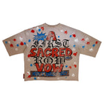 Camisa Box Fit con estilo de manga 3/4, confeccionada en un tono beige con detalles de pintura en rojo, azul y blanco. En el frente, destaca un diseño gráfico con diferentes imágenes religiosas y tipografía, La parte trasera presenta nuevamente las palabras “FIRST ROW – A Sacred Vow” en letras grandes con efecto desgastado. Su combinación de colores, textura y estilo oversized la convierten en una pieza única de inspiración urbana.