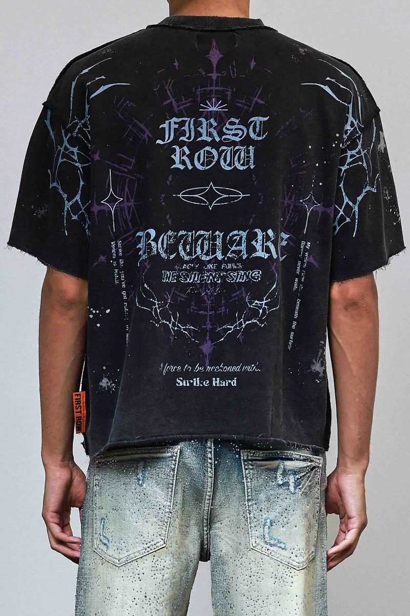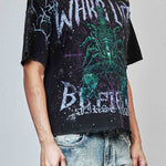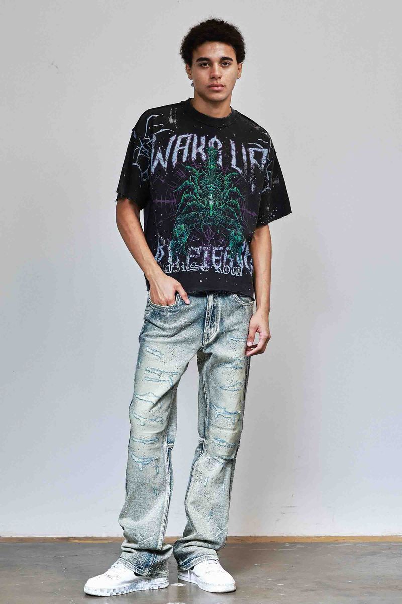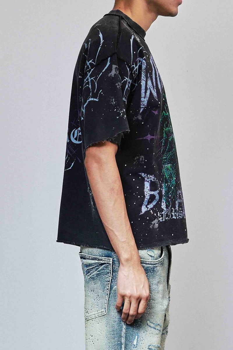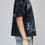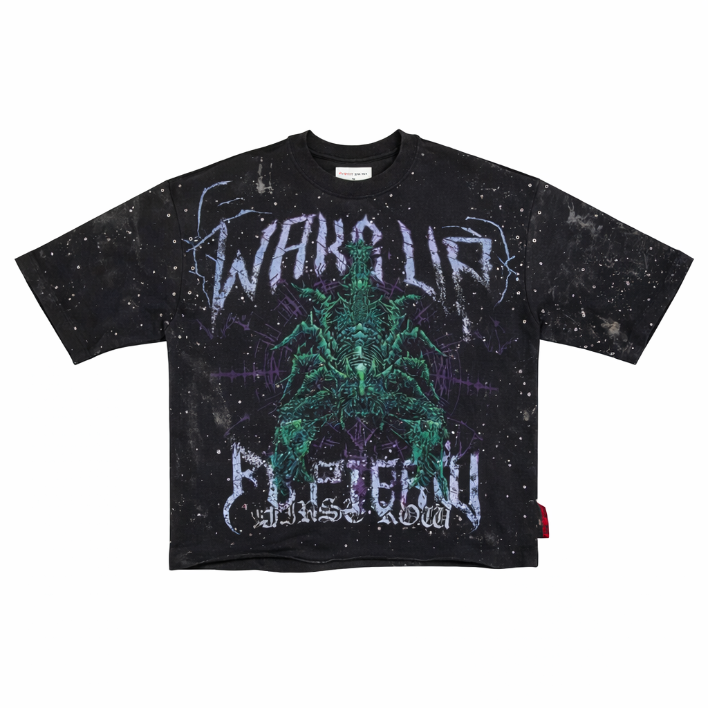 Camisa BoxFit negra con gráfico central en tonos verdes y tipografía grunge. Diseño fuerte y edgy para un streetwear más oscuro.