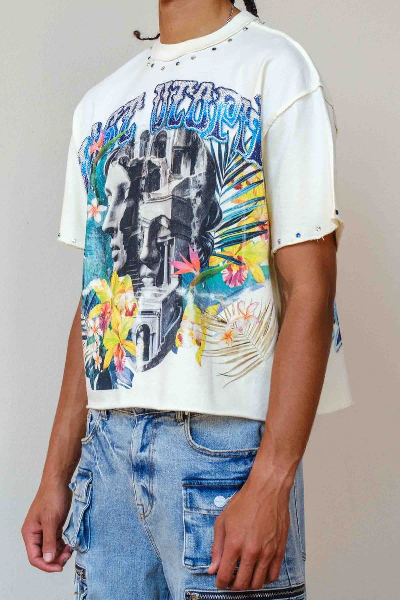 Camisa BoxFit en tono crema con detalles brillantes distribuidos por todo el tejido. El frente destaca un robot de estética futurista rodeado de rosas y un fondo azul eléctrico, acompañado del logo FIRST ROW en rhinestones. La parte posterior presenta los textos LOST UTOPIA y FIRST ROW con gráficos florales y cielo azul. Es una pieza con mezcla de naturaleza y tecnología, ideal para looks urbanos con contraste visual. Perfecta para destacar sin esfuerzo.