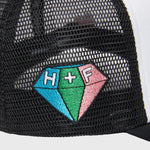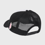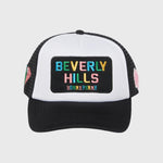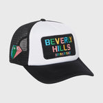 Gorra clásica estilo trucker en color negro y multicolor con parche de marca "Beverly Hills" en el frente. Diamante multicolor en el panel derecho del usuario y logotipo de hombre y mujer en el panel izquierdo.