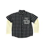 Camisa estilo streetwear de cuadros con diseño en capas. Presenta manga corta tipo camisa clásica con botones frontales y debajo mangas largas en contraste que le dan un efecto moderno y urbano. En la parte frontal incluye el mensaje estampado: “DON’T LET EMOTIONS KILL YOUR DREAMS” en tipografía estilo grafiti. Disponible en combinación negro con crema. Ideal para un look casual con actitud.