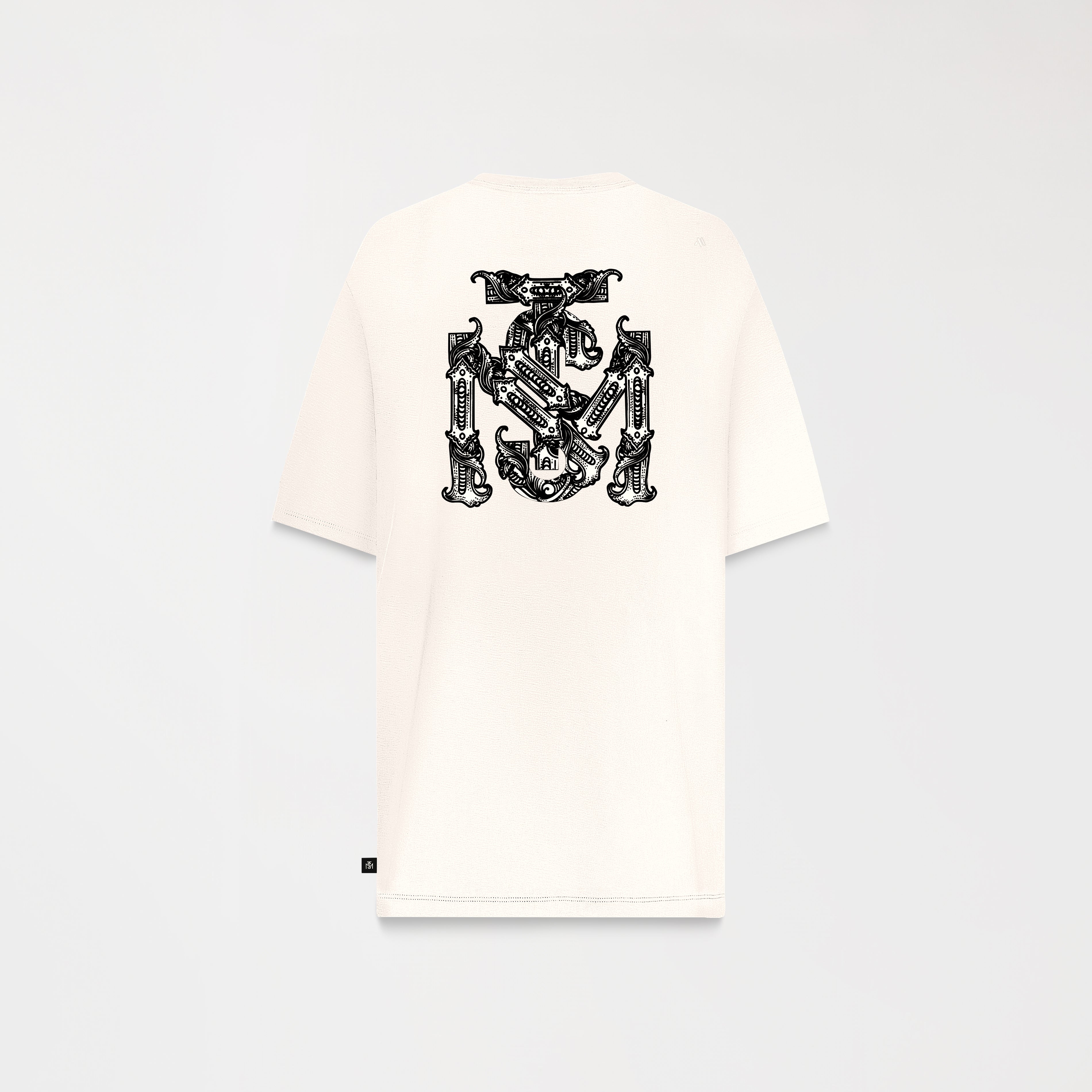 Loan es una T-shirt de hombre, hecha de 100% algodón exclusivamente para Monastery. Esta prenda presenta obras de arte exclusivas para la colección The King en la parte delantera y nuestro icónico logotipo de Monastery en técnica de bordado plano. La parte posterior presenta un eslogan que representa un propósito y un principio de vida. Combinando técnicas de bordado plano, de semialta densidad y alta densidad, esta es una prenda con detalles renovados, como su efecto ahumado, creando un arte que se destaca.