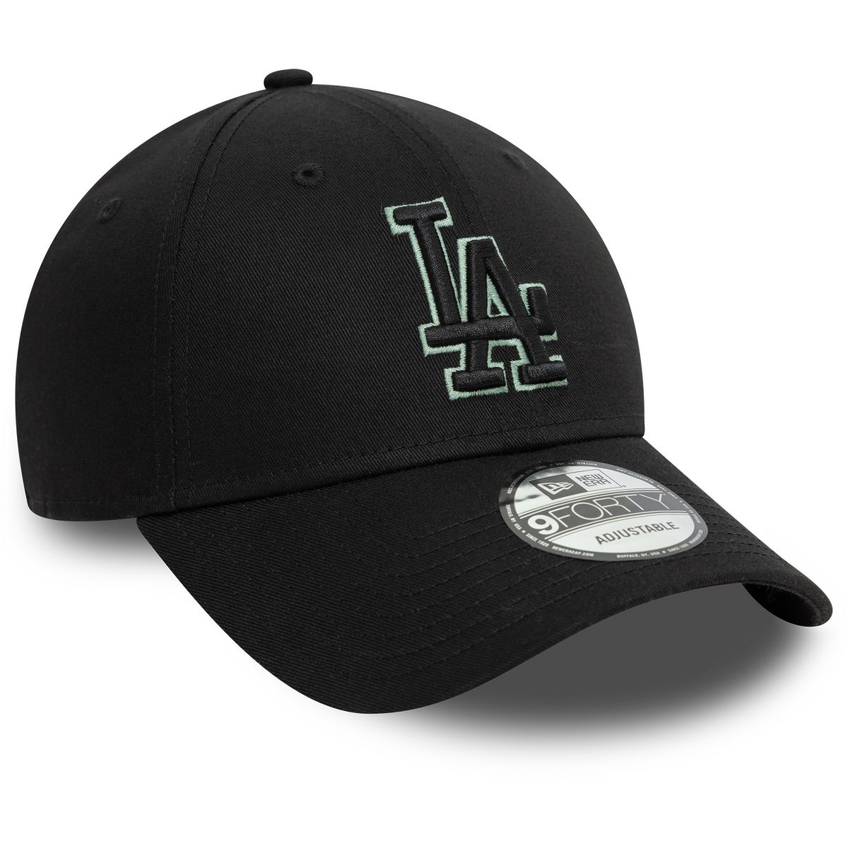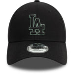 Gorra New Era 9FORTY AF de LA presenta un diseño monocromático de color negro con detalles en verde con el logotipo de LA en los paneles frontales y el flag de New Era bordado del lado izquierdo