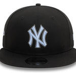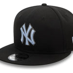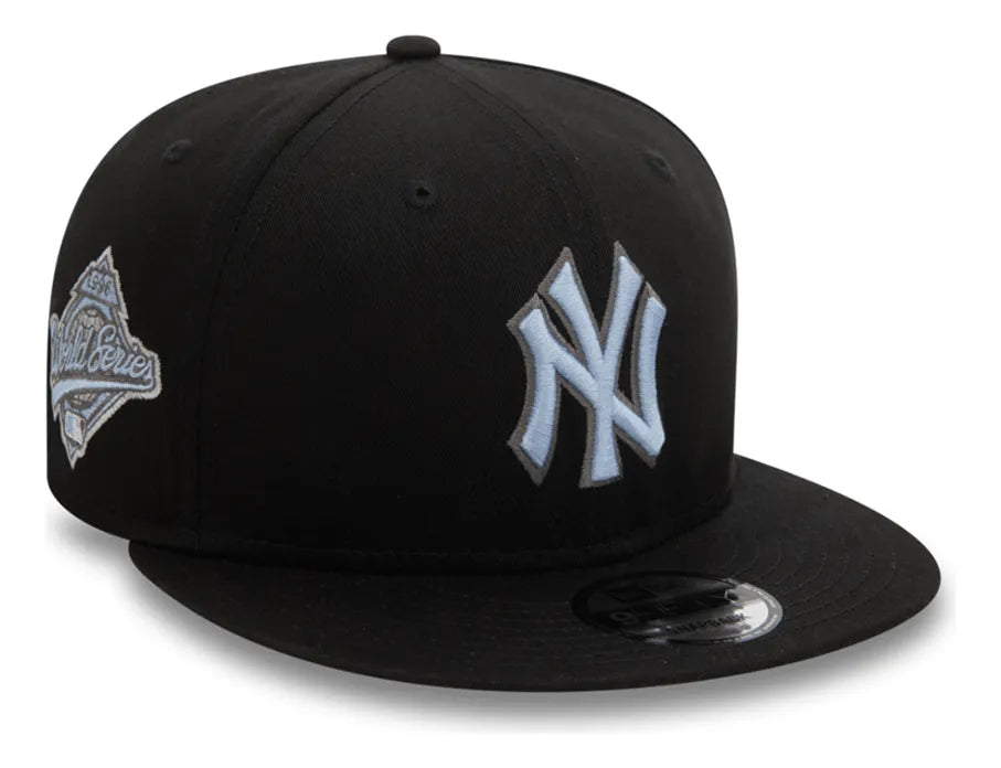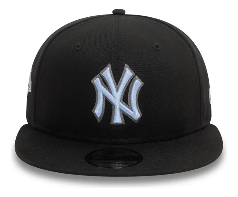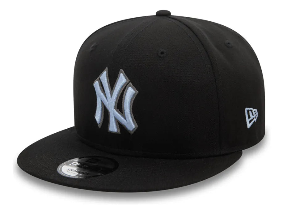 Gorra New Era 9FORTY Snapback de New York Yankees presenta un diseño monocromático de color negro con detalles en baby blue con el logotipo de los Lakers en los paneles frontales y el flag de New Era bordado del lado izquierdo