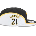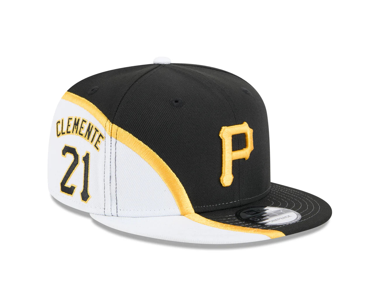 Esta gorra New Era 9FIFTY de los Pittsburgh Pirates rinde homenaje al legendario Roberto Clemente con un diseño en colores negro, blanco y amarillo. Presenta el logotipo bordado del equipo en los paneles frontales y un parche conmemorativo del nombre y número de Clemente en el lateral derecho. Su visera plana con detalle inferior gris y el cierre ajustable tipo snapback garantizan estilo y comodidad.