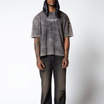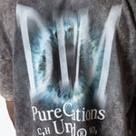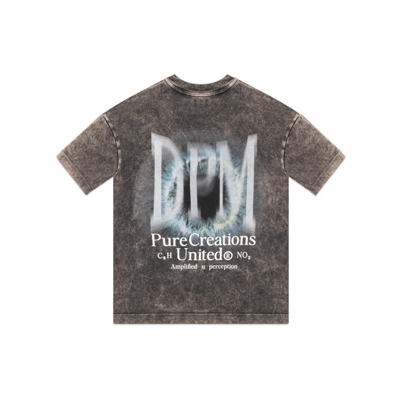 Camisa Box Fit Con un diseño de un texto “Pure Creations United” en el frente y un gráfico de ojo con las siglas “DPM” en la parte posterior.