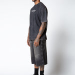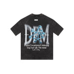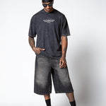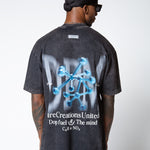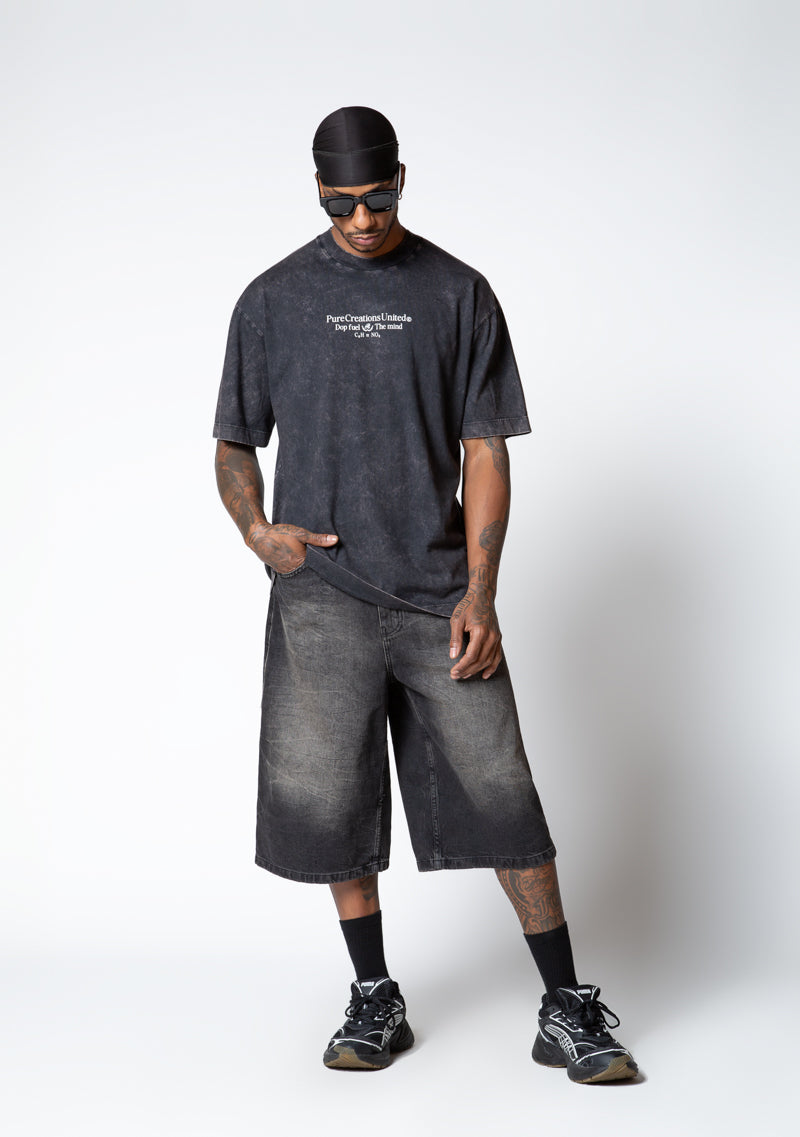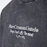 Camisa oversized con un color negro lavado en la parte delantera tiene un diseño minimalista con. una frase. En la parte posterior presenta un diseño gráfico con estructura molecular y la frase “Pure Creations United – Dop fuel the mind”.