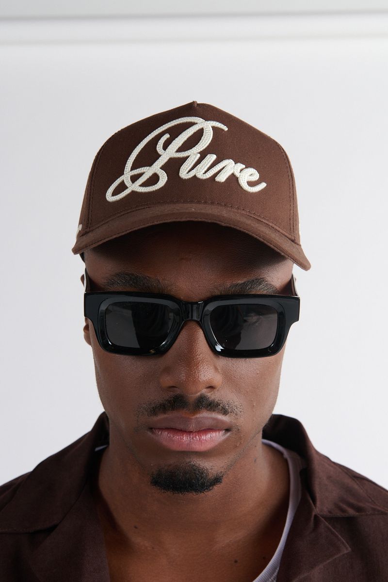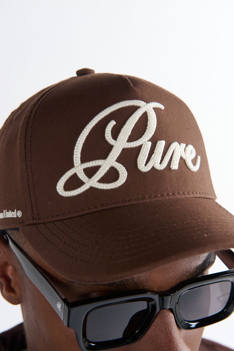 Gorra en tono marrón chocolate con diseño estructurado y visera curva. En el frente destaca un bordado grande en color crema con la palabra “Pure” en tipografía cursiva, creando un contraste elegante y llamativo. En el lateral incorpora un emblema bordado del monograma en el mismo tono claro, aportando un detalle premium y distintivo. Ajustable en la parte posterior, es una pieza versátil que eleva cualquier look urbano con un estilo clásico y moderno a la vez.