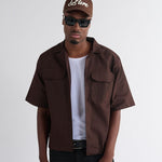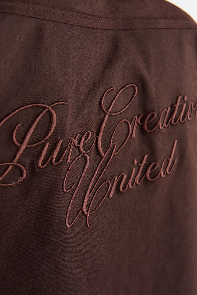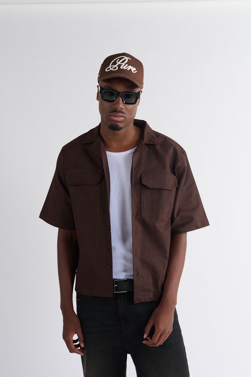 Camisa de manga corta en tono marrón con corte BoxFit y tejido de textura rígida para una estética contemporánea. Presenta dos bolsillos frontales tipo utilitario y un cierre de botones oculto que aporta un acabado limpio. En el frente incluye un pequeño bordado tonal, mientras que en la parte posterior destaca la frase “Pure Creations United” en bordado grande cursivo, añadiendo identidad visual y un toque artesanal. Una pieza versátil que combina estilo urbano con detalles premium.