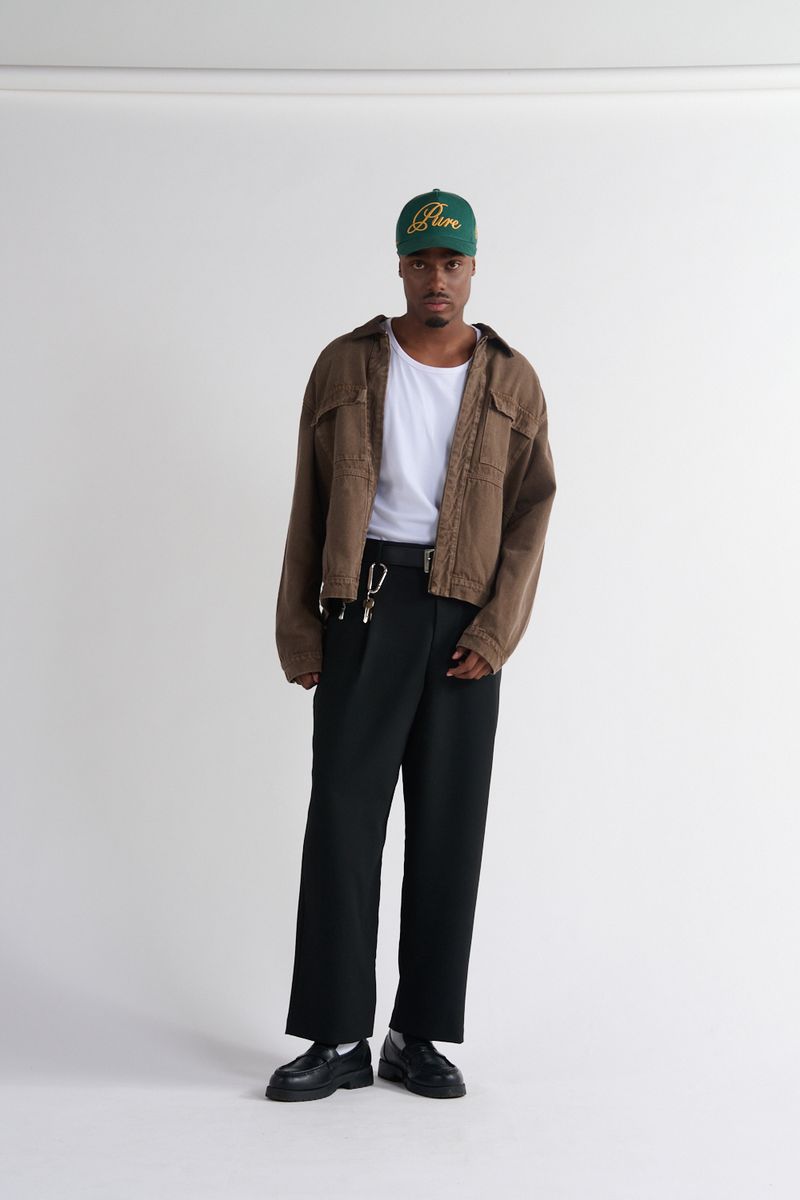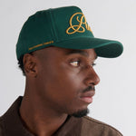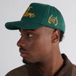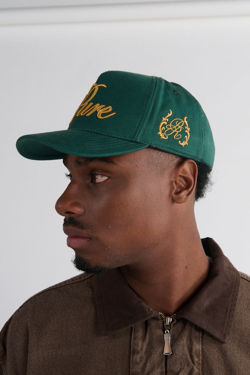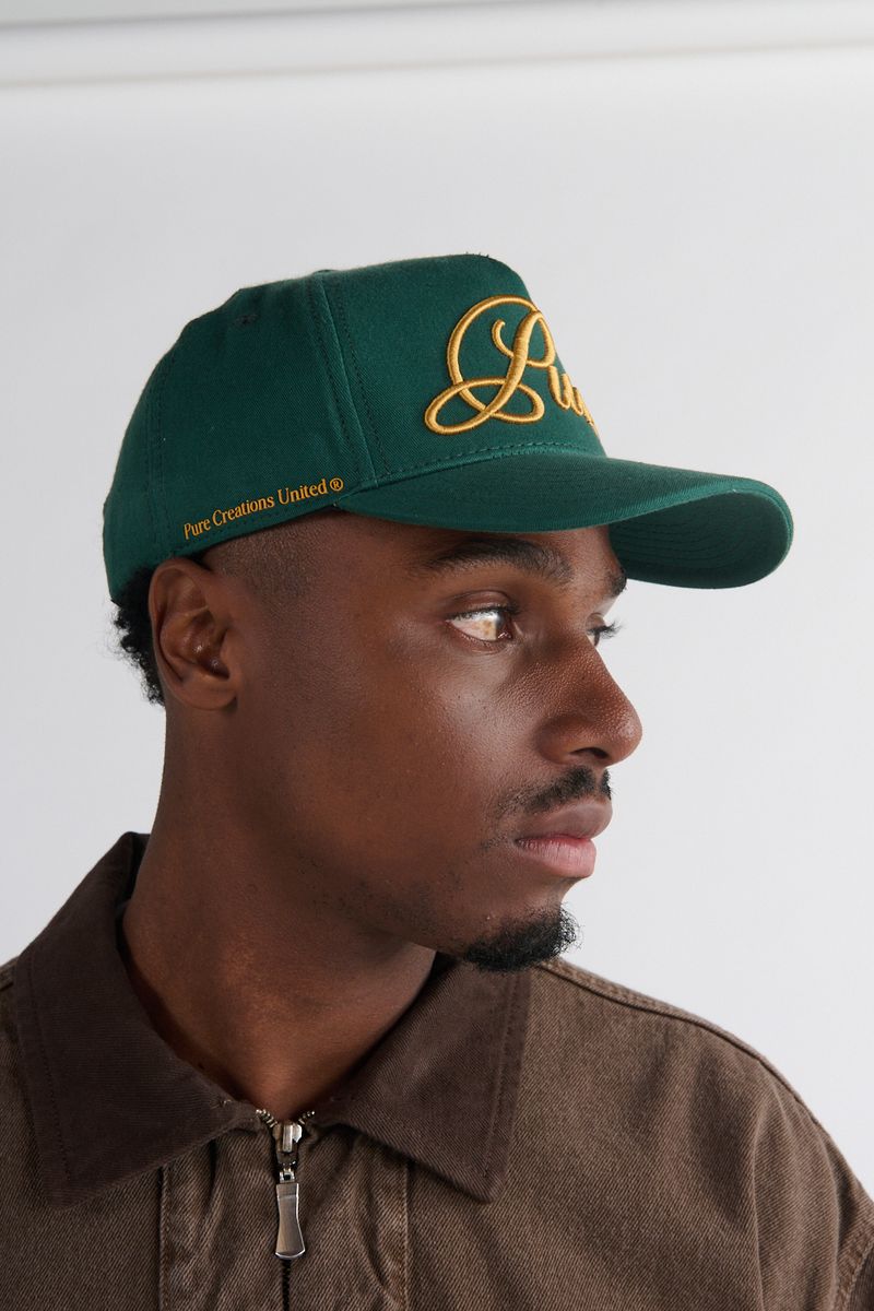 Gorra en tono verde con diseño estructurado y visera curva. Presenta un bordado frontal en hilo dorado con la palabra “Pure” en tipografía cursiva, creando un contraste elegante y llamativo. En el lateral incorpora un emblema bordado tonal también en dorado, aportando identidad y detalle premium. Ajustable en la parte posterior, es una pieza versátil que combina estilo urbano, calidad y carácter distintivo.