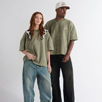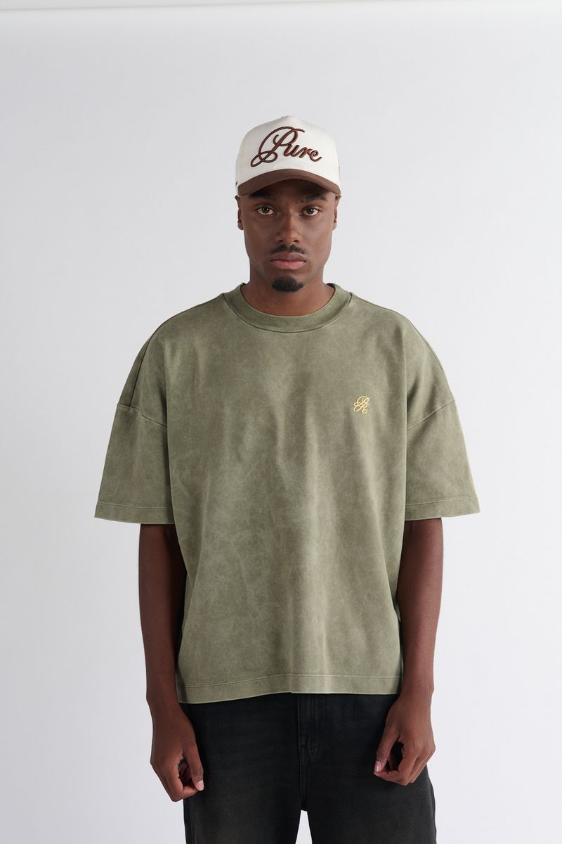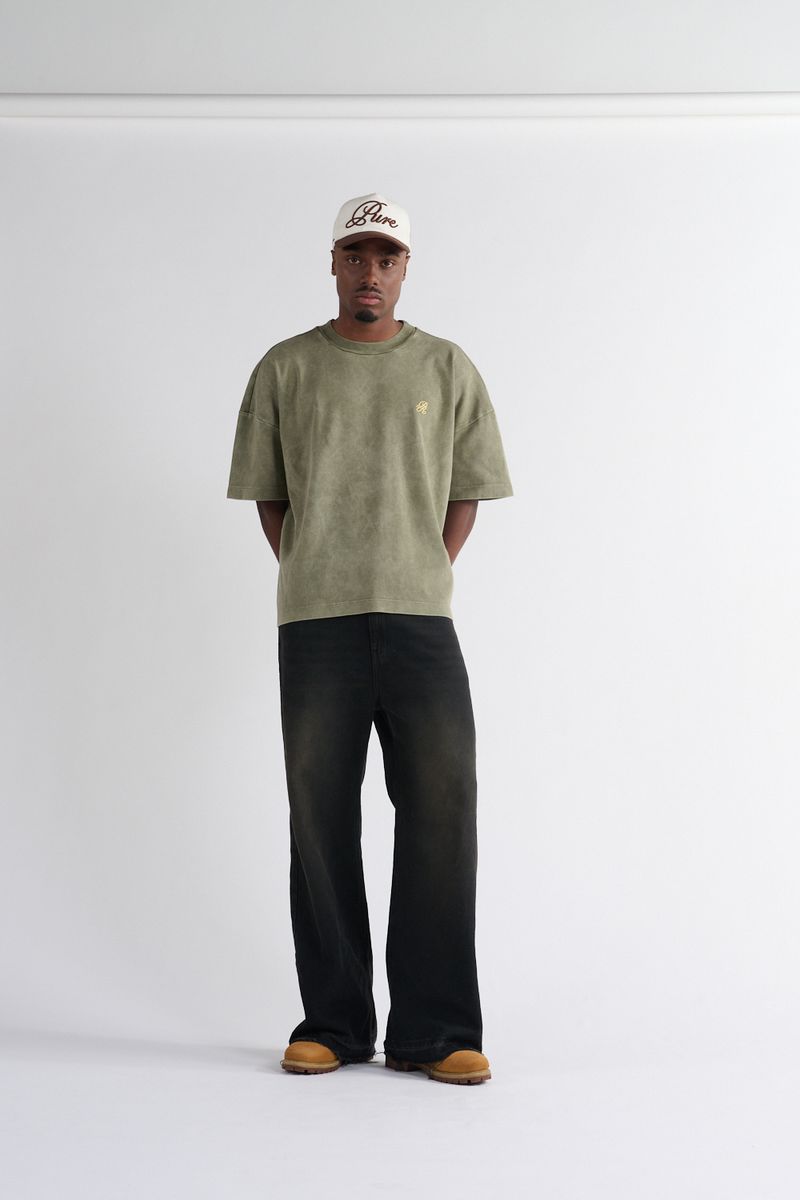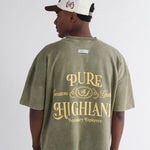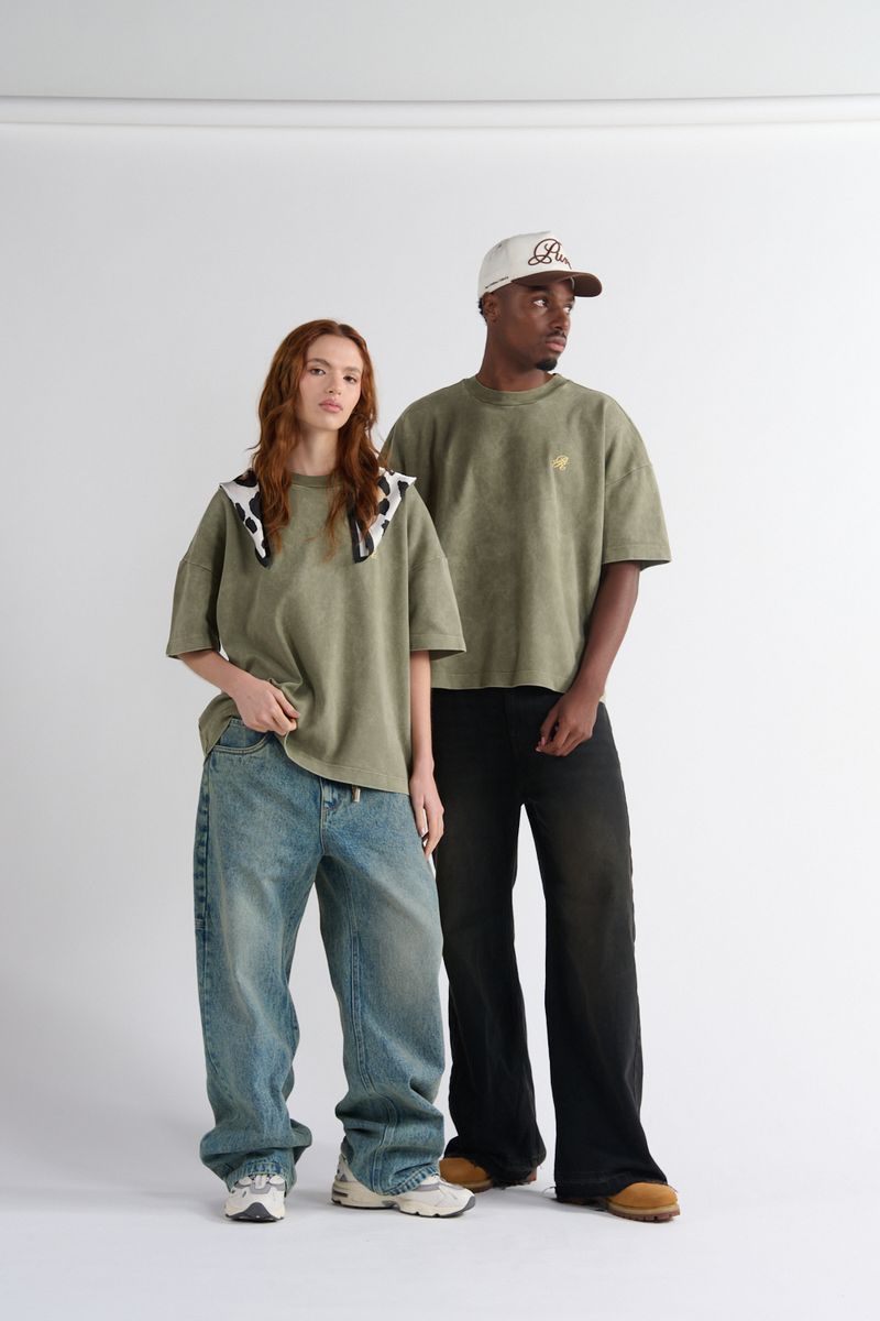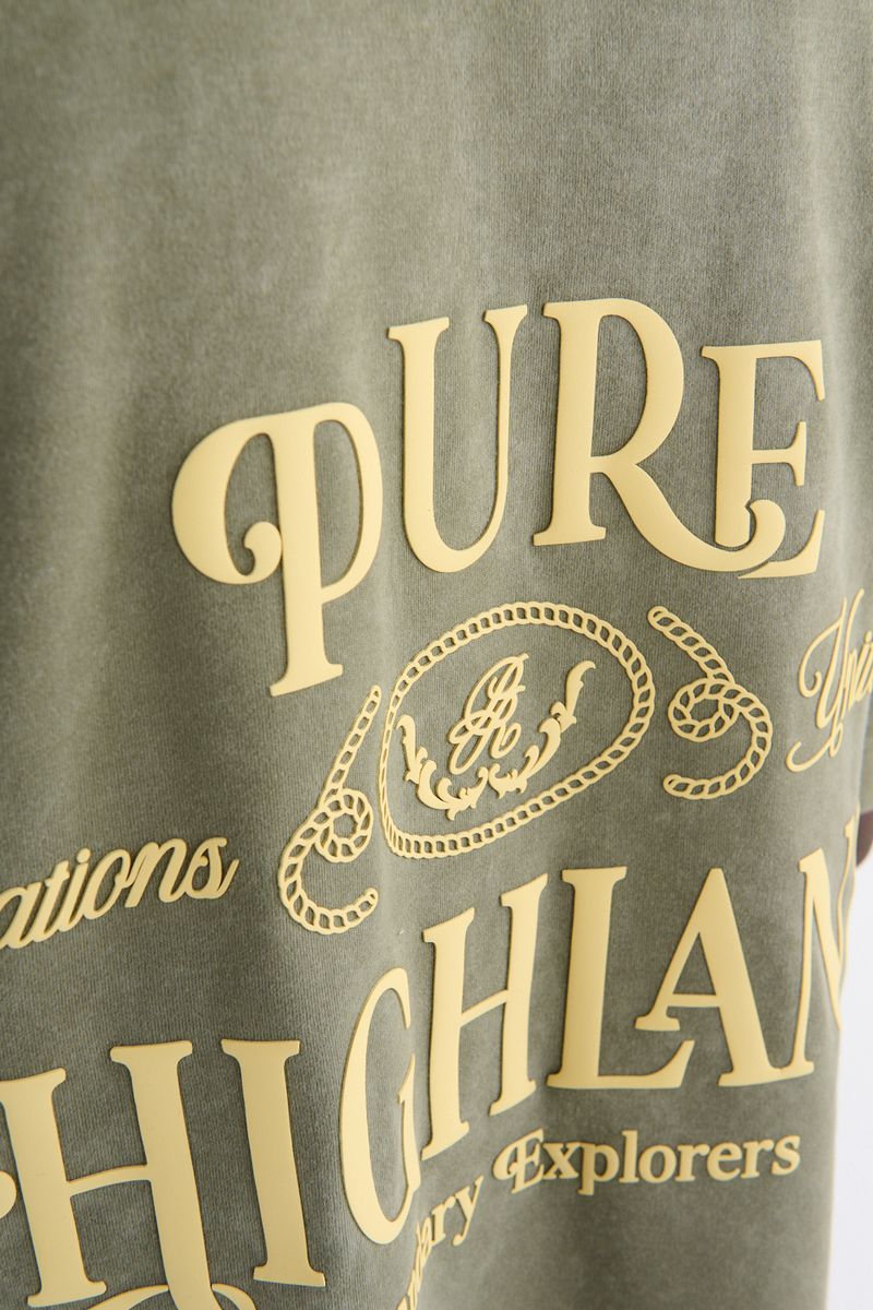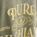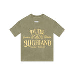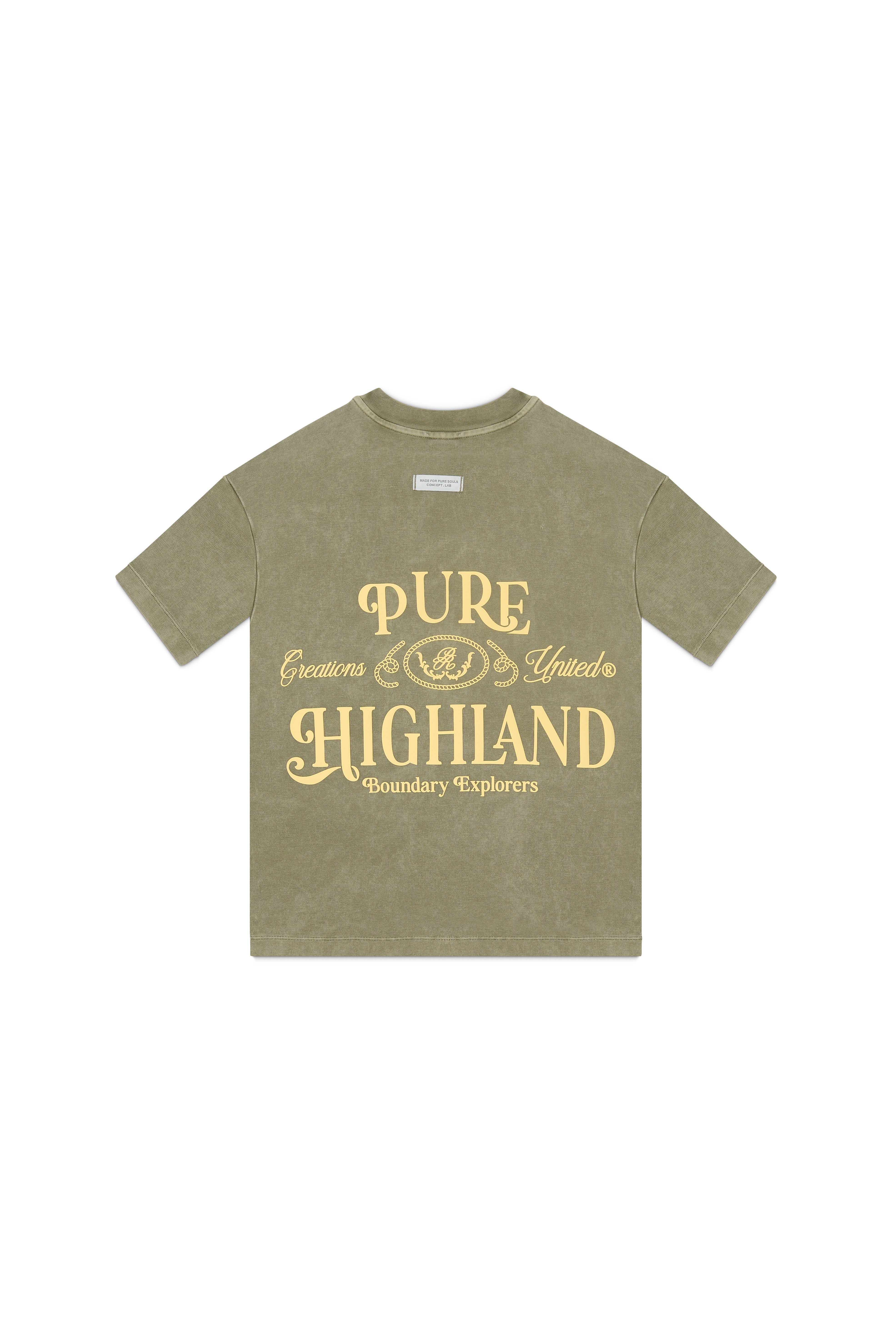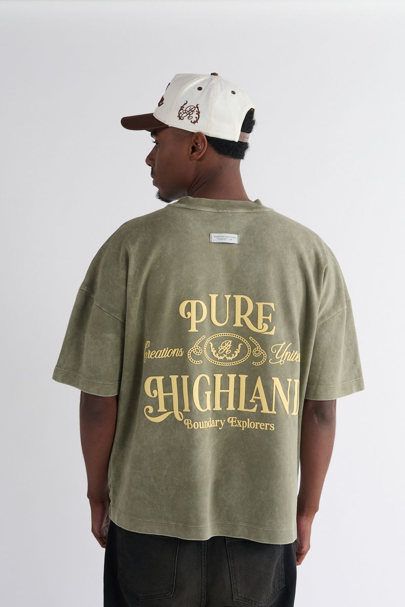 Camisa en tono verde Lavado y corte BoxFit. En el frente presenta un pequeño bordado tonal en color dorado que añade un detalle elegante y discreto. La parte posterior destaca por un diseño tipográfico grande en tono amarillo suave, donde resalta el texto “Pure Highland – Boundary Explorers”, reforzando el carácter artesanal y aventurero de la pieza. Una camisa versátil y cómoda, ideal para looks urbanos.