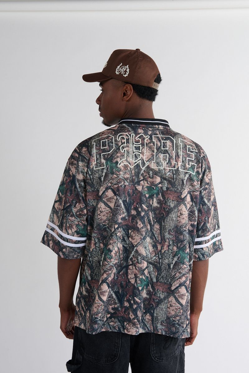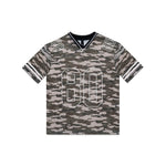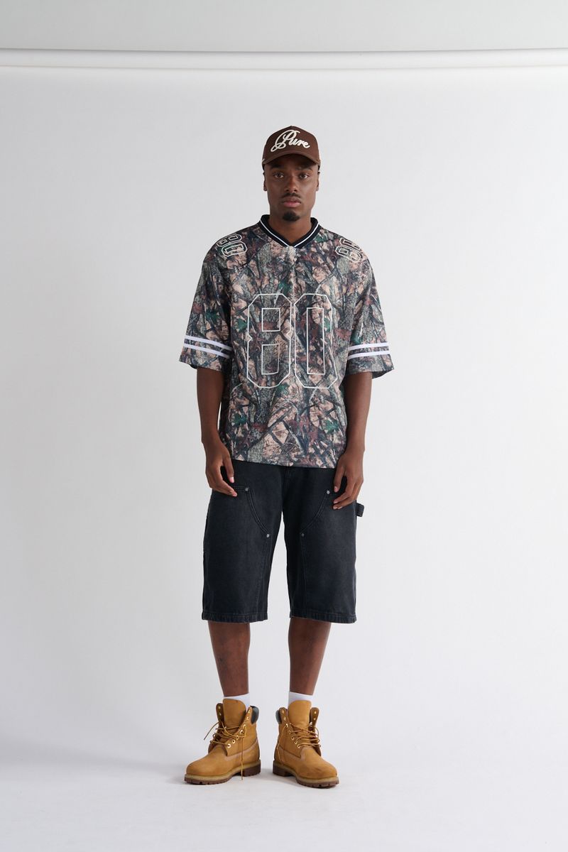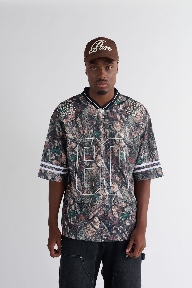 Jersey de camuflaje en tono forest con acabado deportivo y corte Oversized. Presenta el número “80” en el frente y en los hombros, junto a franjas blancas en las mangas que refuerzan su estética atlética. Su estampado integral tipo woodland aporta un estilo urbano con carácter, mientras que el cuello en V añade un toque clásico. Una pieza cómoda y llamativa que combina funcionalidad con una fuerte identidad visual streetwear.