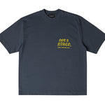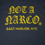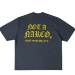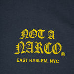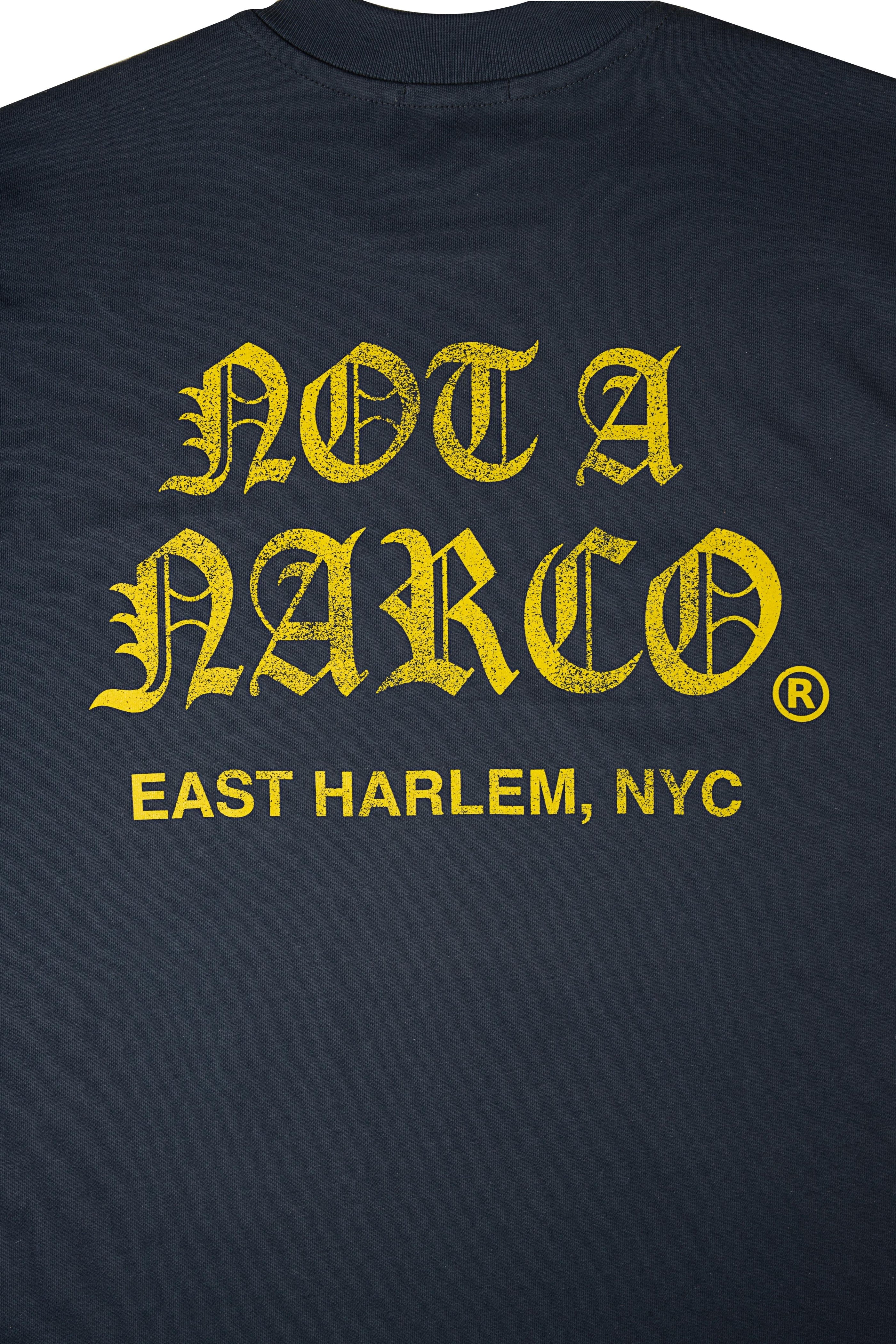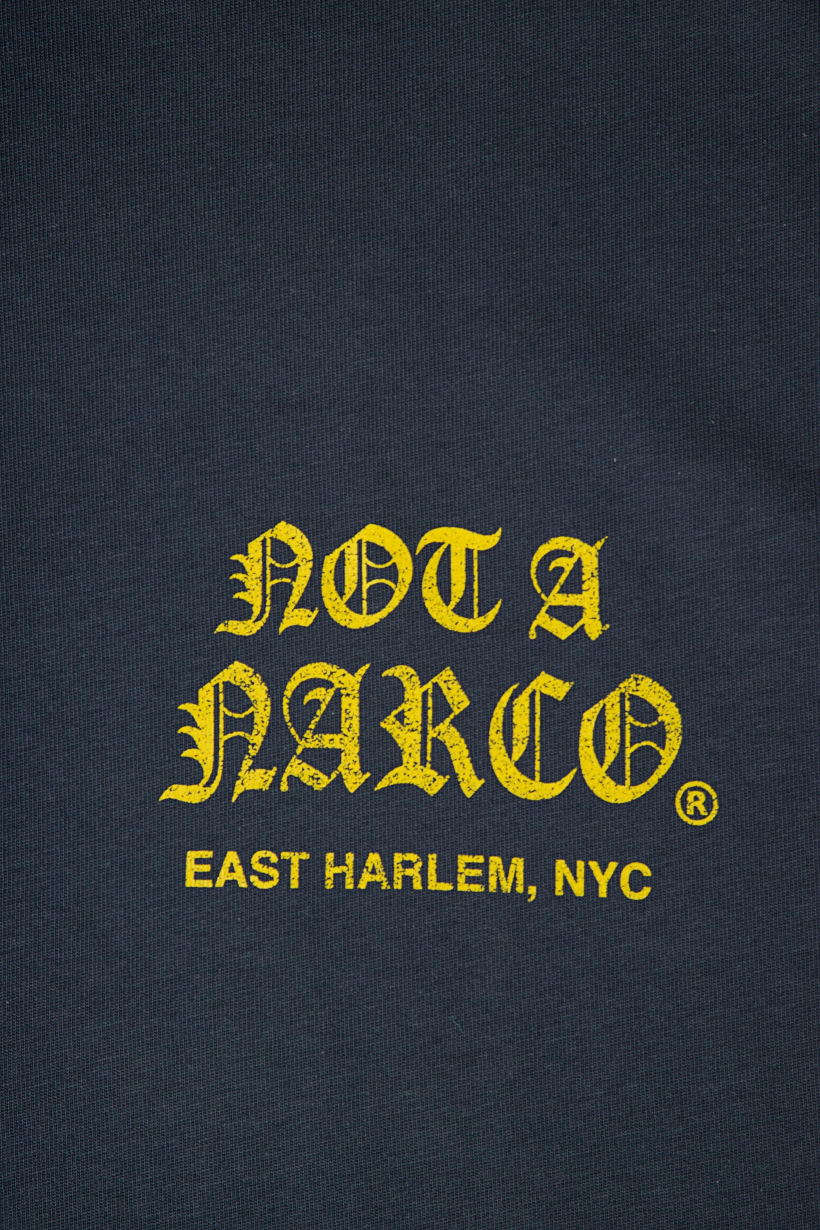 Camiseta de manga corta y cuello redondo en rib en color navy con fit oversized, hecha en algodón premium de alto gramaje. Estampado en serigrafía 'Not a Narco' en el punto corazón y en la parte trasera en color amarillo.
